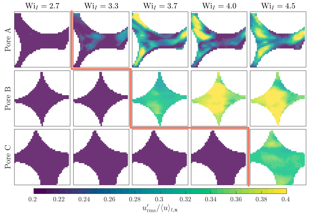 Many energy, environmental, industrial, and microfluidic processes rely on the viscous flow of polymer solutions through porous media. In many cases, the macroscopic flow resistance abruptly increases above a threshold flow rate in a porous medium—but not in bulk solution. The reason why has been a puzzle for over half a century. Here, by directly visualizing the flow in a transparent three-dimensional (3D) porous medium, we demonstrate that this anomalous increase is due to the onset of an elastic instability in which the flow exhibits strong spatio-temporal fluctuations reminiscent of inertial turbulence, despite the vanishingly small Reynolds number. We find that the transition to unstable flow in each pore is continuous, arising due to the increased persistence of discrete bursts of instability above an onset flow rate; however, this onset value varies from pore to pore. Thus, unstable flow is spatially heterogeneous across the different pores of the medium, with unstable and laminar regions coexisting. Guided by these findings, we quantitatively establish that the energy dissipated by unstable pore-scale fluctuations generates the anomalous increase in flow resistance through the entire medium. Thus, by linking the onset of unstable flow at the pore scale to transport at the macroscale, our work yields generally-applicable guidelines for predicting and controlling polymer solution flows.
